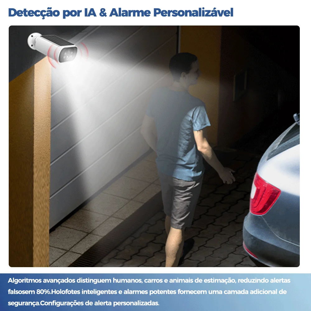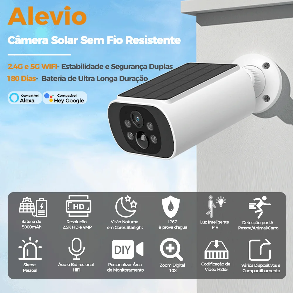 ALEVIO 2. Câmera solar externa 5K/4MP WIFI, câmera de segurança à prova d'água IP67 com tempo de espera ultra/luz inteligente PIR/visão noturna colorida/conversa bidirecional/humano/animal de estimação/detecção de movimento/sirene DIY, câmera de vigilância IP para ambientes internos/externos, inserção de suporte Cartão Micro SD, funciona com Alexa e Google