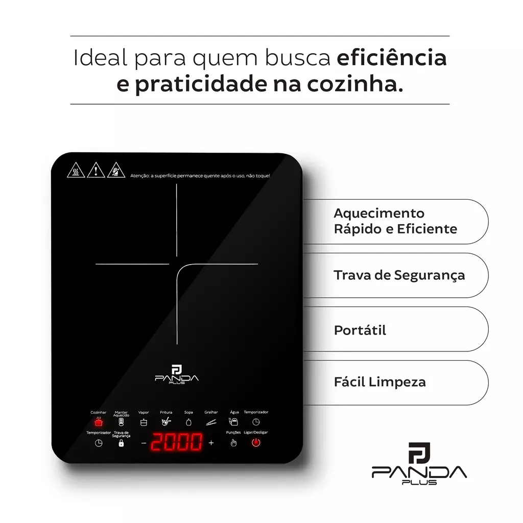 O Cooktop de Indução Portátil Panda Plus traz praticidade e segurança para o seu dia a dia. Compacto e elegante, é perfeito para cozinhas pequenas ou como complemento na sua casa.