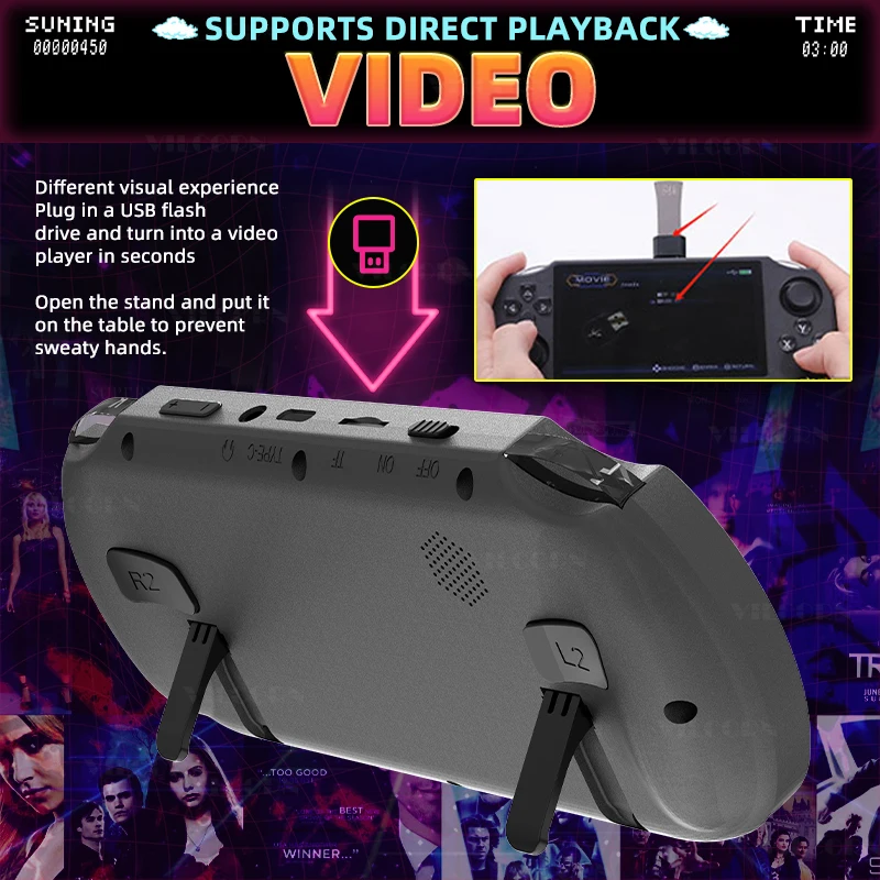Este console portátil foi projetado pensando na conveniência.Possui um suporte nas costas.Agora você pode apoiá-lo e curtir seus jogos ou assistir vídeos com as mãos livres.Seja em uma mesa ou escrivaninha, oferece uma experiência de visualização estável e confortável.
